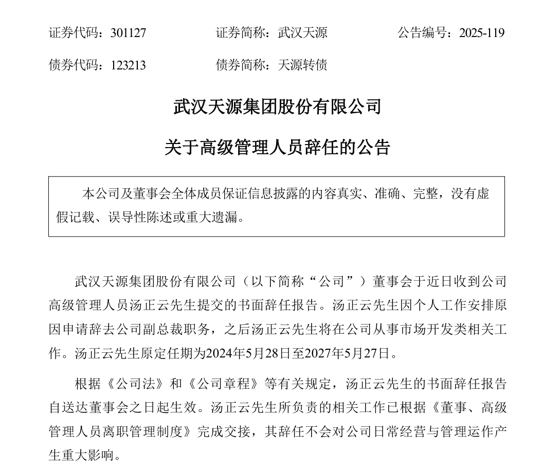 中國(guó)固廢網(wǎng)獲悉,12月12日,武漢天源公告,湯正云先生因個(gè)人工作安排原因申請(qǐng)辭去公司副總裁職務(wù),之后湯正云先生將在公司從事市場(chǎng)開發(fā)類相關(guān)工作。